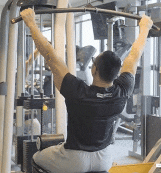 ハイ・プルダウンでは、より体が後ろに傾き、上背部への刺激が強くなる。スクイーズを効かせるために、幅広のハンドルを選ぶことを忘れずに。