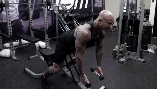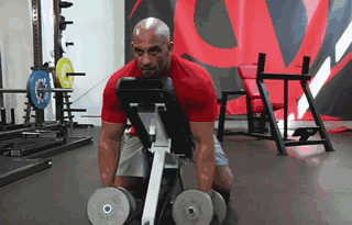 オーバーヘッド・ダンベル・ロウとは異なり、この種目ではダンベルを両手でしっかりと持ち、中殿筋と下殿筋の収縮を促しながら上に持ち上げることに主眼を置く。もちろんバーベルを使ってもよいが、胸のシートベンチが下側の邪魔になるような、あまり高い位置まで持ち上げてはいけない。