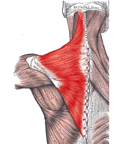 1.上部の線維は上方に向かい、肩甲挙筋および菱形筋と相乗的に作用して、肩をすくめるか、または肩甲骨を動かす。肩甲骨を持ち上げるボーンを完成させる。頭部と頚部の伸展、側屈、対側回旋。