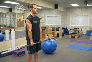 両手にバーベルを持ち、両腕をまっすぐ伸ばして立つ。