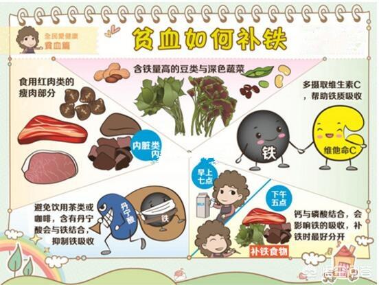 貧血の妊婦は、食事に気を配り、栄養を強化し、動物のレバー、動物の血液、鉄分の多い野菜や果物を多く摂る必要がある。食物から摂取した鉄分の体内吸収率や体内変換率は十分ではないので、鉄分のサプリメントを追加する必要もある。鉄のサプリメントには、鉄の吸収を促進するビタミンCを補う必要がある。