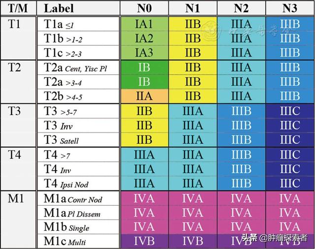 このTNM病期分類表を見ても理解できないかもしれません。Tは腫瘍の大きさを表し、例えばT1a≤1は肺がんのT1 a期が1センチ以下であることを意味します。Nはリンパ節の大きさを表しますが、Nが0123に分けられていることがわかりますが、これはどういう意味でしょうか?0はリンパ節転移がないことを意味し、123はリンパ節転移があることを意味しますが、異なる転移部位によって3種類の症例に細分化されますが、数字が大きいほどリンパ節転移が強力であることだけを覚えておく必要があります。Mは転移状況を意味し、abcの3種類の状況を含み、同じM1cは全身に多発転移が起こっていることを意味します。また、表の中にⅠ、Ⅱ、Ⅲ、Ⅵの記号がありますが、これは対応する臨床病期分類であり、TNMの状況に基づいており、レベルが高いほど肺がんの病期分類は遅くなります!