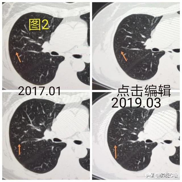 肺結節を見つけるための次のステップは、良性か悪性かを判断することである。良性の結節は、肺のリンパ節、形の悪い腫瘍、硬化性肺細胞腫など、間違いなく何でもないものである。残りの結節は良性または悪性の可能性があるもので、このような結節に対する治療の一般原則は経過観察を勧めることであり、結節の特異性(形態、大きさ、密度など)に応じて、見直しの時期は3ヵ月から1年である。結節の中には、炎症性結節のように経過観察中に吸収されて消失するものもあれば、肉芽腫のように変化しないものもあり、これは良い情報である。経過観察中に、結節の肥大、すりガラス結節の中の実成分や固形成分の増加、結節の緻密化、末梢血管が伸びているのが見えるなど、悪性の徴候があれば、積極的に対処すべきです。実際、人を見るように、正義の顔は、一般的に良い人、凶暴で悪質な悪人であり、いくつかの一時的な人の行動の観察を通じてのみ見ることができない、ルールは一般的に恐れていない場合は、悪い行動があることを発見した場合は、タイムリーに対処する必要があります。図1、左肺上部のすりガラス状の結節(オレンジ色の矢印)を発見し、2年以上経過観察したが変化なし。図2、右肺上部に2個の小さなすりガラス結節(オレンジ色の矢印)、2年後に消失した。図3、右肺上部のすりガラス状の小結節、3回目の経過観察で大きくなっているので、前向きに対処することを勧め、外科的病理検査でin situ癌、つまり前癌病変を発見すれば、肺癌の芽を摘むことができる。