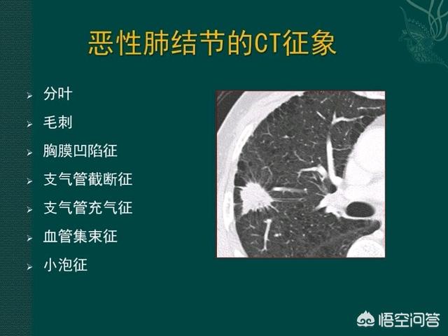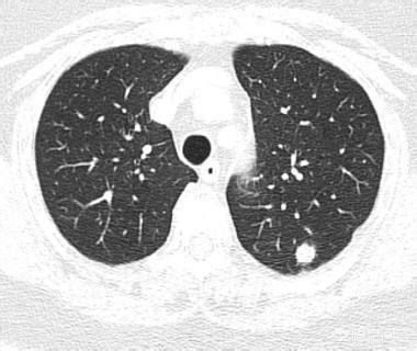 一方、固形肺結節では、悪性より良性の方がはるかに多い。悪性の肺結節には通常、バリ、小葉、気管支切断、棘突起、胸膜陥凹症状、血管集簇症状がみられる。