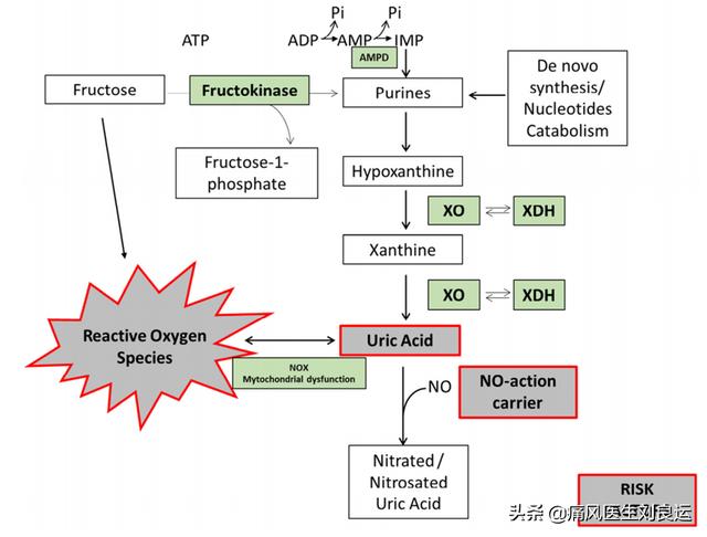 核酸の異化から尿酸への代謝は、複数の生成経路と複数の酵素の関与と制御を伴う非常に複雑なプロセスであり、血中尿酸濃度が可溶性上限を超えると絶対的高尿酸血症となる。