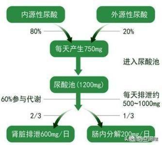 尿酸は体内で合成された後、健康な人では通常1200mg貯蔵されており、これを尿酸プールと呼んでいるが、そのうち60%が代謝に関与している。健康な人体では、1日に約700mgの尿酸が生成されるが、その80%は内因性の深部尿酸であり、20%はプリン体を多く含む食品から生成される。