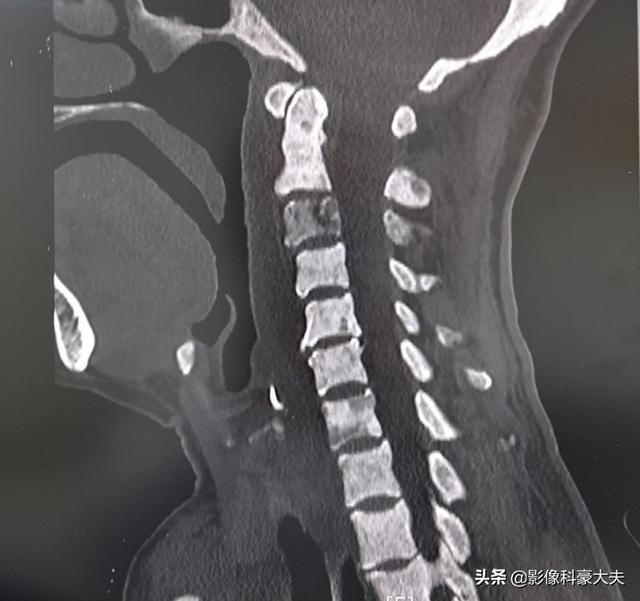 この老人は胃がんの患者で、手術前に首が少し痛いと言っていたが、その結果、頸椎CTで頸椎に広範な転移が見つかり、手術には適さなくなった。