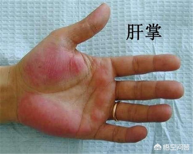 2.肝臓の手のひらこれは特殊なタイプの手掌で、典型的には手掌の表面と大小魚の間に薄片状のうっ血斑を呈し、その周囲には多数の拡張してつながった動脈血管があり、圧迫すると青白くなることがある。