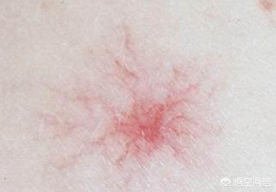 クモ状母斑は、毛細血管が密集している顔、首、胸に現れやすい。放射状の毛細血管に囲まれた小さな赤い点のような形をしており、細いクモの足のように見えます。一方、クモ状母斑は肝臓疾患の現れです。