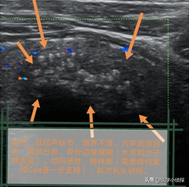 甲状腺悪性結節のより特異的な徴候は、微小石灰化、不規則な辺縁、アスペクト比1以上である。その他の悪性徴候には、充実性低エコー結節、ハローの欠如、甲状腺外浸潤、頸部リンパ節の超音波異常徴候が含まれる。頸部リンパ節の異常徴候には、丸みを帯びたリンパ節、不規則または不鮮明な境界、不均一な内部エコー、リンパ門の消失、または真皮髄質の境界が不明瞭であることに加え、主に微小石灰化、嚢胞性変化、高エコー、リンパ節内の末梢血流が含まれる。