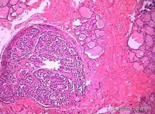 次に、濾胞性甲状腺がんです。このタイプの濾胞癌は、私たちの乳頭癌とは異なり、血液転移を起こしやすく、全体的に乳頭癌よりも悪性度が高いが、それほど悪性度は高くない!