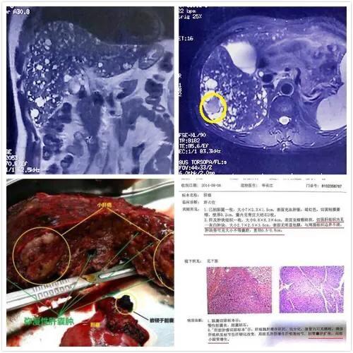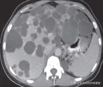 最初の病態:肝臓の孤立性単純性多嚢胞性嚢胞で、通常は比較的小さい嚢胞であり、その正確な原因は不明である。通常、腎の多発性嚢胞や多嚢胞性腎と合併することはない。多発性肝嚢胞単独では、綿密な観察と定期的な経過観察により、通常、患者の大部分は生涯無症状または無増悪であり、外科的治療の必要はない。末梢の肝嚢胞が大きくなり、肝性心膜陥没の症状を引き起こした場合にのみ、開窓してドレナージを行う肝嚢胞の外科的治療が考慮され、通常は症状の緩和を得ることができる。
