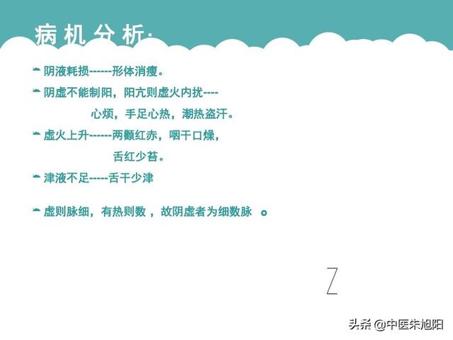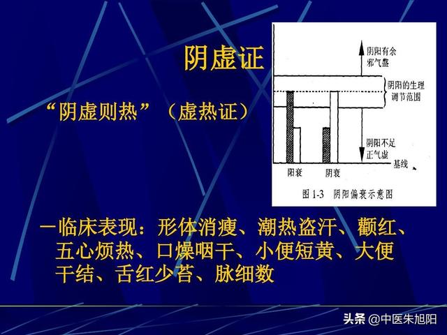 - 黄帝内経』には「陰虚内熱」とあり、陰血不足、陽気亢進、陽熱が体内で蒸散して内熱の症状を形成し、足の裏の発熱を特徴とし、陰虚内熱の全身症状を伴う。陰と血は人体の物質的な基礎であるため、陰虚の体格は痩せ型の人に多く、陰虚は二次的に陽気が過剰になり、しばしば感情的な焦り、口や舌の渇きを引き起こす。舌が赤い、毛が少ない、尿が少ない、便秘、ほてりや寝汗、手足や心臓の熱感などの基礎症状。