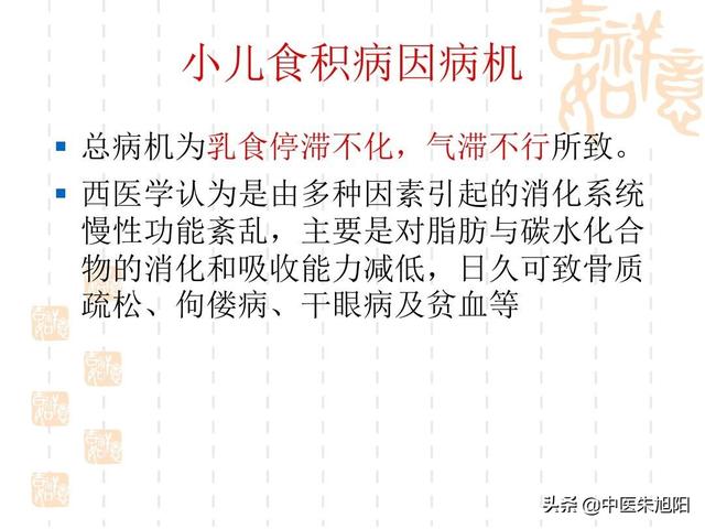 - 飲食物の停滞により、動きのない夜間の蓄積はより深刻で、夜間の腹部膨満感や睡眠障害につながることが多い。 この証は思春期や幼児に多く見られ、この年代は脾胃の機能がまだ完全ではなく、飲食物の停滞などの問題を抱えやすい。