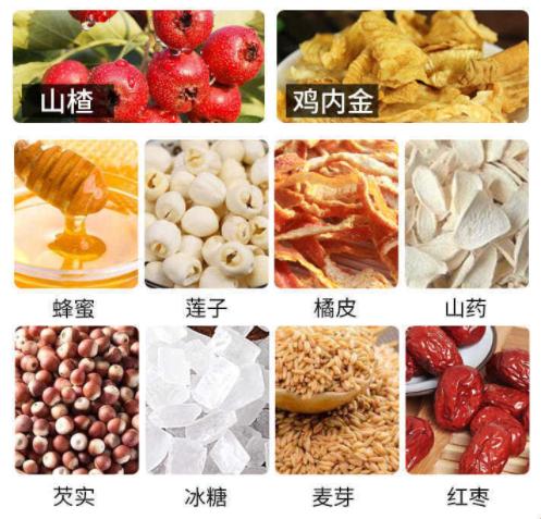 原材料ローズヒップ50g(食物と胃を排除し、血液循環を活性化し、滞りを取り除く);菊10g(食物と停滞を除去し、渇きを癒し、飲酒を誘発する);麦芽15g(食物を排出し、胃を強化する);ユリ目精液15g(胃を養って下痢を止める、脾臓を強化する)脾臓を強化する);ディオスコレア・オポシタ15g(脾臓を強化し、胃を滋養し、体液を生成し、肺に効く);乾燥オレンジピール15g (脾を強め、胃を養い、気を整え、湿を乾かす)