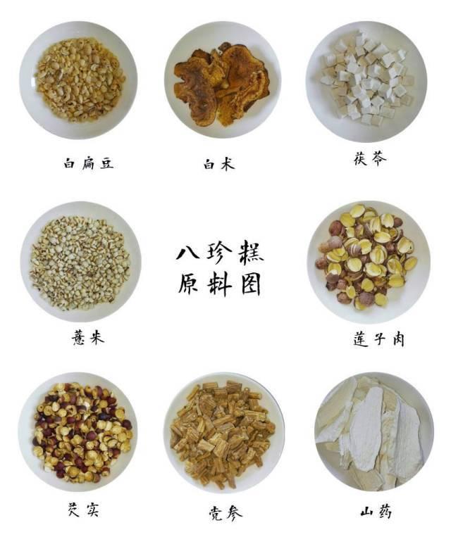 白レンズ豆30g、Atractylodes macrocephala 30g、茯苓50g、Semen Coicis 50g、蓮の実50g、Fructus Gorgonzola 50g、Radix Codonopsis Pilosulae 50g、Rhizoma Dioscoreae 60g、蓮根粉末60g、もち米粉100g、米粉300g、砂糖適量。