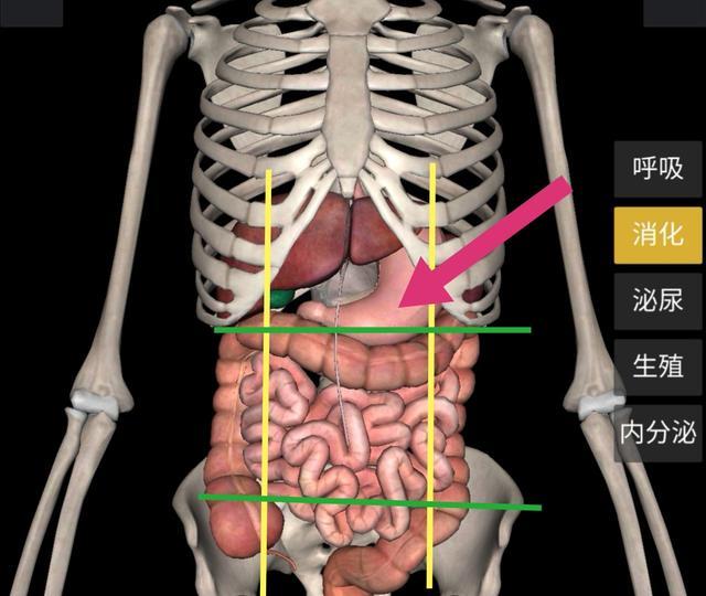 赤い矢印は胃を指している。胃の大部分は上腹部にあり、まず胸の剣状突起を触ってから下を向くと、胃の前壁に触れることができる。しかし、胃は私たちの体の消化器官の中で最も大きな消化器官であり、一般的に4つの部分に分けられます。胃底部の膨らんだ部分の平面より上の心窩部の左側、角切開と胃洞と呼ばれる線より下の胃の湾曲の最も下の点、胃洞と胃底部の間の胃体部、心窩部別館2.5cmを下図のように心窩部と呼びます: