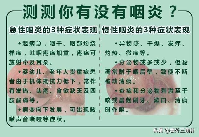 1.咽頭炎慢性咽頭炎の患者は、咽頭の異物感や不快感に加え、乾燥感や痛みなどがあり、朝方に吐き気や咳などの症状が出る患者もいます。咽頭炎の主な原因は、分泌物、肥大したリンパ濾胞の刺激です。