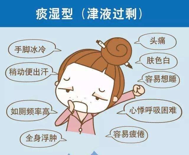 痰湿は、一般的に脾臓が健康でないために、水が正常に輸送することができない、水や水分が凝縮の蓄積は痰になることができる場合は、ドリンク、ドリンクに収集することができ、痰湿の痰は、広義の痰を指し、肺が唾を咳による痰に加えて、また、体内や様々な痰の証拠の形成の体表面を流れる人体の体液の異常が含まれています。痰は、脾臓が痰の元となり、肺が痰の貯蔵庫となる」という。さらに、痰は腎陰が不足して内熱が体液を燃やすとき、あるいは腎陽が不足して水が肺にあふれるときにできる。痰湿体質の人は、一般的に太っていて、目が腫れぼったく、胸や上腹部が充血し、疲れやすく眠く、便の回数が多く形が悪く、尿の色は透明で水っぽい。