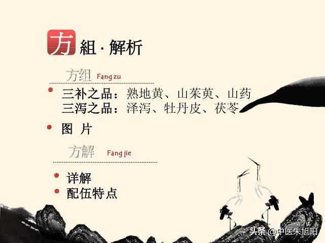 これら3つの強壮剤と3つの排膿剤が強力に作用し、腎陰虚の治療に特化し、同時に肝と脾を補う。