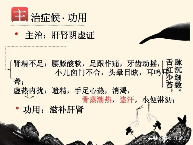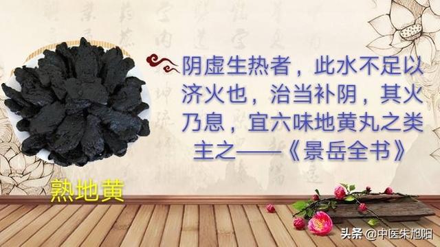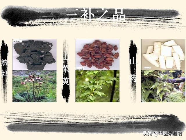 熟地黄の処方は王薬で、腎精を補い、陰を養い、腎を補い、赤身の骨髄を加え、桜肉は肝腎を補い、山芋は脾を補い、精を補い、両者を合わせて大臣薬とする。しかし、熟地黄の量は非常に多いので、総合的に見ると、やはり腎陰の主な強壮剤である。