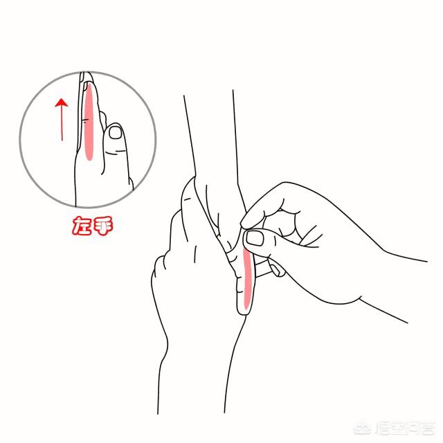 6.四横経をつまみ、練る(四横経は一般的に滞りを解消するツボの一つで、民間伝承ではノマを摘むのに使われる部位の一つである)。