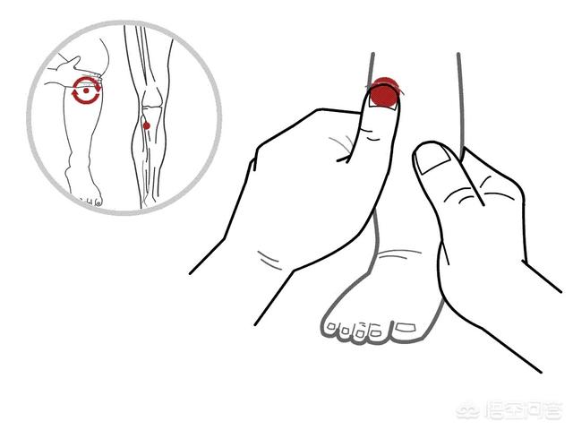 場所:足三里は下腿の前外側にあり、外膝の目から3センチ下、脛骨外側の前縁から中指1本分横にある。