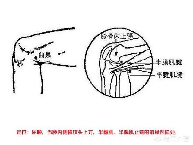 クワン・ポイント膝の内側横筋の頭、半腱様筋と半膜様筋の前縁の窪みにあるツボ。このツボは足相肝経の合谷であり、肝火を清め、湿熱を除き、利尿作用がある。腹部膨満感や腹痛、排尿困難、下痢、尿崩症、精液漏出などの治療によく用いられる。