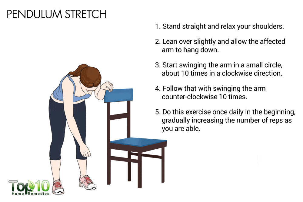 患者は体を前屈させて立ち、患肢は完全に弛緩させ、上肢の重力を利用して痛みのない範囲で前後左右に振れる振り子をシミュレートする。患者が耐えられるようであれば、さらに両手に重りを持つこともできる。
