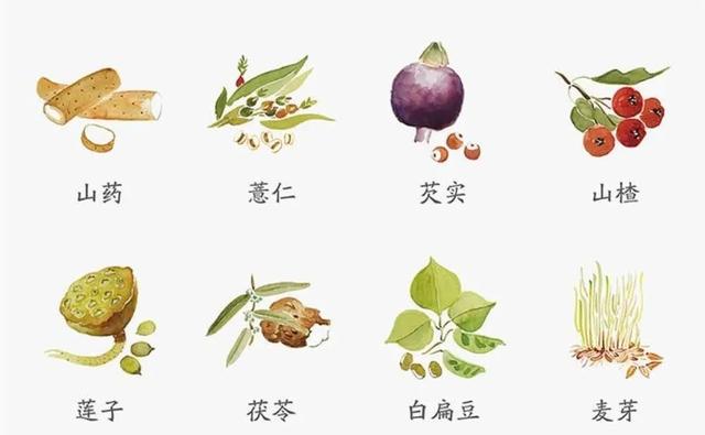 山芋、蓮肉、白レンズ豆は脾陰を養い、サンザシと麦芽は食滞を除き、茯苓と大麦は湿を去り、ゴルゴン果実は収斂作用がある。ヨブの涙は冷たいが、炒めた後、その冷たさを取り除き、脾陽を傷つけずに湿を取り除くことができる。