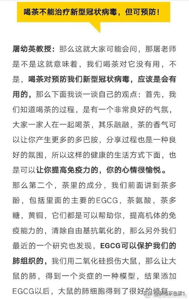 湖南テレビの茶チャンネル『茶ニュース世界』の番組で、浙江大学茶科学学部の専門家であるトゥー・ユーイン教授が最近インタビューに答え、お茶は新型肺炎を治療することはできないが、新型コロナウイルスを予防することはできると語った。
