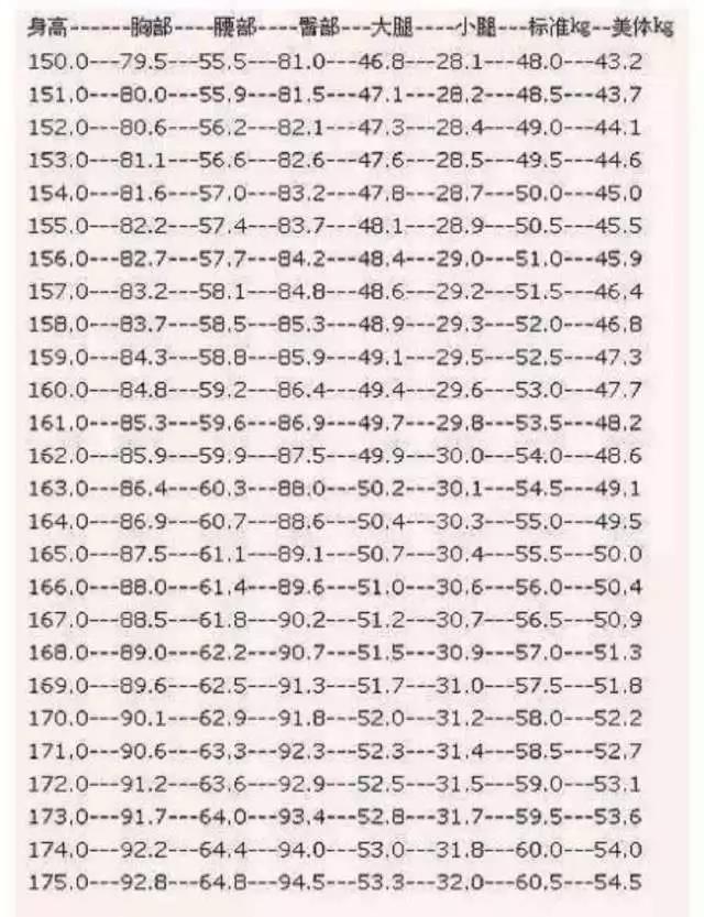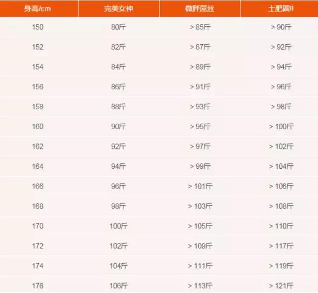 これは2019年にインターネットで出回った「女子の標準体重」で、女性スターの体重の標準と言われている(例えば、166.5cmのヤン・ミーは約90~95キロ、168cmのジャン・シュウジンは約96キロ、170cmのニー・ニーは約100キロで、多くの女優が以下の表に沿っている)。表厳しすぎる」と吐き捨てられたが、そんな "厳しすぎる "体重表で、コメント欄には「まだまだ太ってる」「ダイエットを続けないと」という女子が続出!また、この "完璧な女神 "基準で将来の彼女を探すという男子もいた!