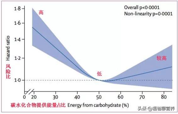 - 炭水化物のエネルギー供給が40%未満、あるいは70%を超えると死亡リスクが高くなる。一方、適度な炭水化物摂取(50~55%)は死亡リスクが最も低い。