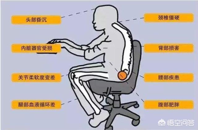 長時間座っていると、人体の重さが腰仙部に集中し、圧力分布が均一でなく、腰の筋肉に負担がかかりやすく、長期的には椎間板組織の弾力性や脊椎骨棘につながりやすい。同時に、胃と腸にとって、座りっぱなしは遅い蠕動運動によって引き起こされ、消化液分泌の減少によって引き起こされるだけでなく、腹部膨満感や便秘を引き起こし、悪化させる。座りっぱなしで血液循環が悪くなると、心機能が低下し、心筋萎縮を引き起こす。中国医学はまた、座りっぱなしの傷肉、座りっぱなし、血液がスムーズではない、運動不足は、筋肉の弛緩、弾力性の低下、下肢の腫れ、疲労、さらには筋肉の硬直を作り、痛みやしびれをもたらすと信じている。同時に、座りっぱなしの首、肩、腰、背中は固定された位置を維持し続け、椎間板の棘間靭帯は緊張と硬さの状態で長い間、痛みにつながる。座りっぱなしはまた、害の多くは記載されません引き起こす。