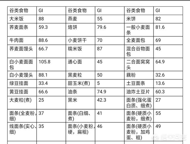 血糖指数(GI)は、食品摂取による血糖反応の生理学的に重要な指標である。GI値の高い食品は、消化管の消化が速く、完全に吸収され、血液中にグルコースが速く、消化管の低GI食品は長い時間滞在し、ピーク値の後に血液中に低速グルコースの放出は、低下速度が遅いです。ですから、GI値の低い食品(穀類)を選ぶようにしましょう。以下は主な穀物のGI値である。