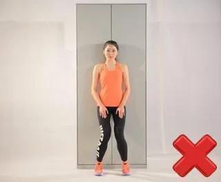 壁に向かって静的スクワットをする場合:膝がつま先を越えてはならない。