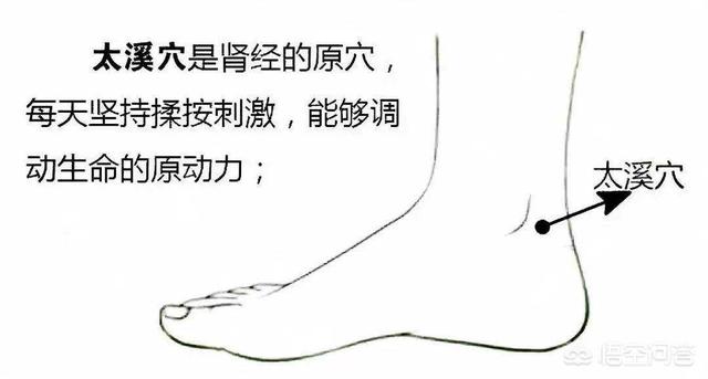 太渓点は腎臓の経絡エネルギーの収束点であり、古代の医学者は「太陽に還る9つのツボのひとつ」と呼んでいた。太渓は、身体の原動力の動員を刺激し、それを永泉のツボに蓄えることができるので、身体が健康な土台を持つことができる。このため、足の心臓を揉んだり、足を浸したり、金鶏の単体動作を毎日行うことで、腎の経絡を開き、火を源に引き戻すことができるため、腎の気を補充することができる。