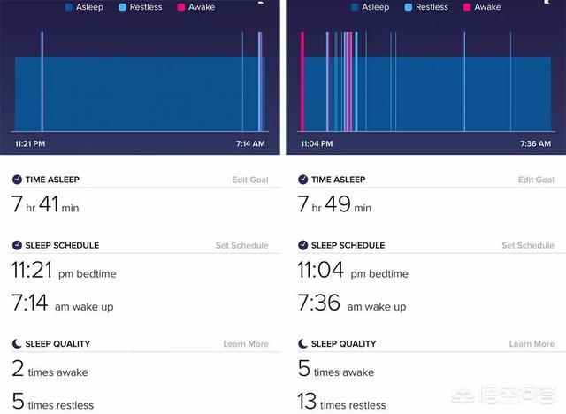 15日間毎日早寝早起きを続けたモニカは、睡眠の質をチェックするためにフィットビットで睡眠を記録し始めた。下のグラフは、それぞれ質の高い睡眠の期間と悪い睡眠の期間を示している。