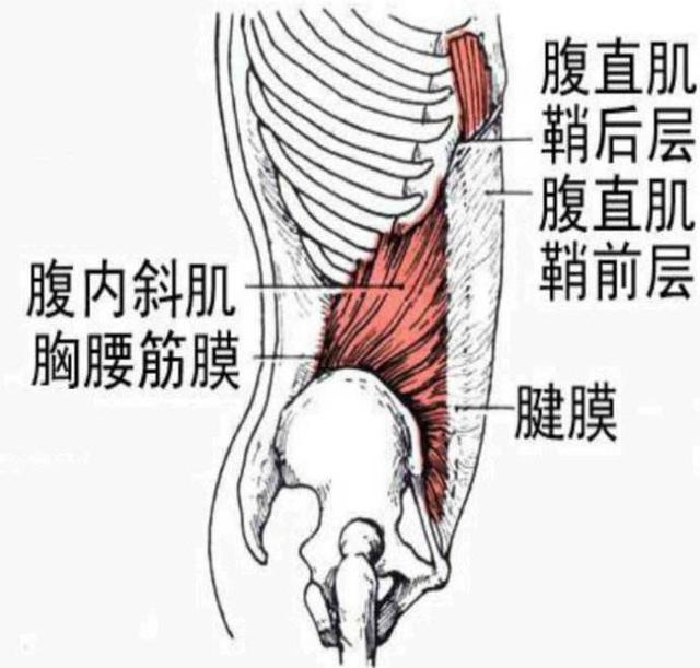 内腹斜筋は、外腹斜筋の深層面に位置し、筋束の大部分は内側上方、下部筋束は内側下方に向いており、内腹斜筋の腱膜として腹直筋の外側縁に変位している。