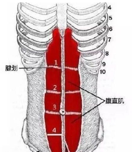 腹直筋は前腹壁の正中線の両側に位置し、上部が広く下部が狭い帯状の筋肉で、その全長は3〜4本の横腱によって複数の筋腹に分かれ、結合組織からなる腹直筋鞘の前層に強固に結合している。ボディビルのトレーニングでは、上腹部と下腹部に分けて運動するが、上腹部と下腹部は完全につながっており、分割線はない。