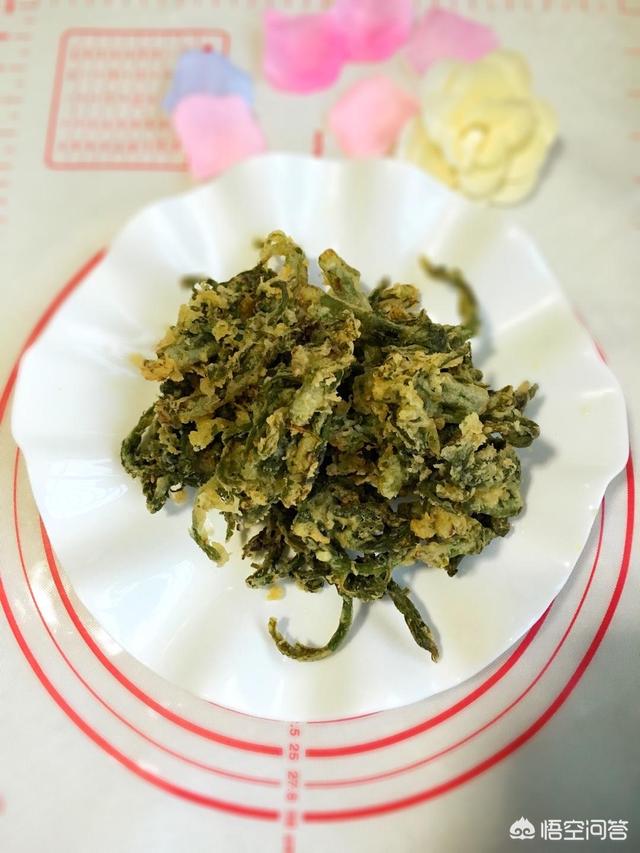 タンポポは洗って乾燥させ、卵と小麦粉に水を混ぜてペースト状にし、1本ずつ肉汁に浸し、フライパンから出してきつね色に揚げ、カリッと香ばしく仕上げる。