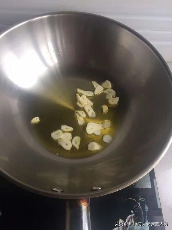 フライパンに油を入れ、煙が出るまで熱し、ニンニクのスライスを入れる。