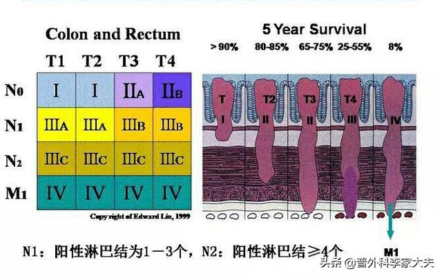 上記の大腸の解剖学的構造から、大腸は後腹膜に浸潤していることがわかる。国際的な腸癌のTNM病期分類によると、①、大腸癌のTステージは少なくともT4病期レベルに達している。TNM病期分類によると、患者は少なくともIIB期の中期の腸癌患者であり、状況が悪化すればIV期の進行腸癌患者である可能性がある。腸癌には腹膜転移があり、腹膜転移は腸癌の予後不良の主要な危険因子の一つとして認識されている。