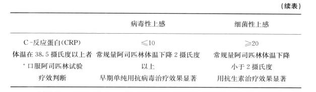 ルーチンの血液検査で白血球(WBC)数や好中球率が正常値より有意に高くない場合は、ウイルス感染が考えられ、その逆もまた然りである。C反応性蛋白(CRP)やカルシトニノーゲンPCT(PCT)も細菌感染の有無を判断するのに用いることができ、CRPは感度が高いが特異度が低く、PCTは感度がやや低いが特異度が高いことに注意すべきである、要するにCRPが正常値より高くても細菌感染の有無は確認できないが、PCTが高値であれば基本的に細菌感染が確認される。