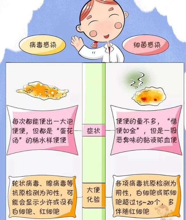 第三の方法:子供の便を見る.ウイルス性の風邪では、典型的なロタウイルス感染症やアデノウイルス感染症に一致する、水っぽい、卵の雫のスープのようなゆるい便をする傾向がある。一方、細菌性の風邪の子供たちは、細菌感染による粘液膿血便やゆるい糊状便をし、細菌が血流に毒素を放出することによって引き起こされる腸の炎症性敗血症感染症を起こす。