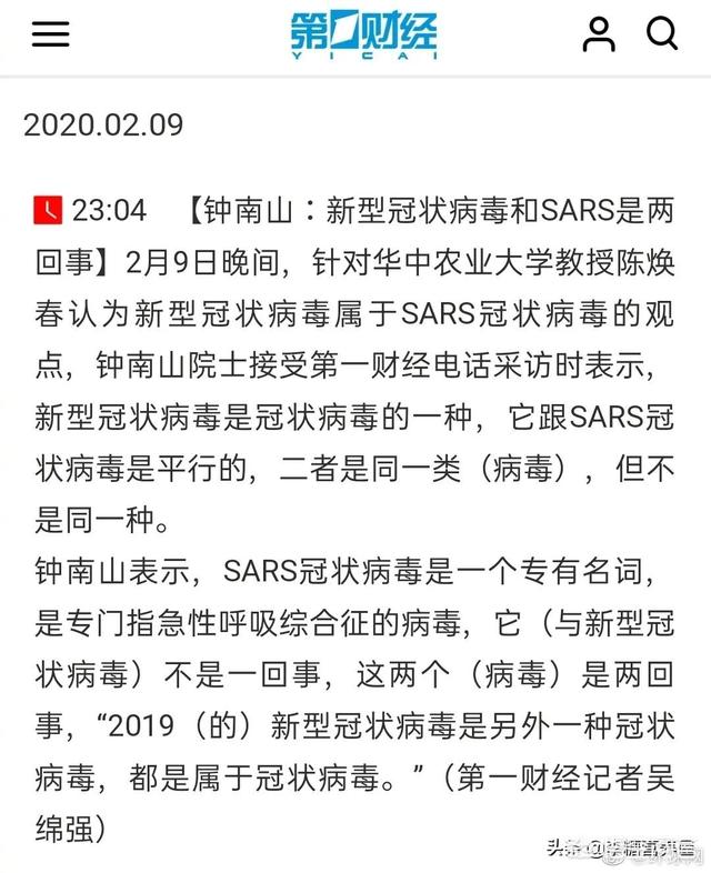 中南山氏は、新型コロナウイルスはSARSコロナウイルスではないと述べた。