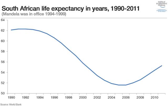 このような研究結果は、多くの公的機関によって認められており、2013年の世界保健機関(WHO)のHIV治療年次報告書によれば、抗レトロウイルス治療が普及するにつれて、エイズ関連死は世界的に大幅に減少し、平均余命は著しく伸びており、低・中所得国であっても、感染者が発症初期に治療を受ければ、通常の余命に近い生活を送っている。HIVが平均余命に与えた影響は大きい。冒頭で述べた南アフリカの例に戻ると、HIV感染者と健常者の平均余命の差は、早期に治療を受けた人では20%に縮まる。下の図に示すように、南アフリカの平均寿命は2005年の54歳から2011年には約60歳まで再び伸びている。