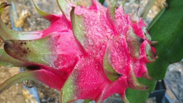 鮮やかな赤と緑の皮で、龍の外燐のような鱗に覆われ、ドラゴンフルーツと名付けられた。果肉の色の違いによって、赤い皮と白い果肉、赤い皮と赤い果肉に分けられ、現在ではこの2つが最も一般的なホット品種の1つとなっている。