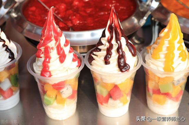 白砂糖、黒砂糖、甘い菓子、砂糖漬けの果物、アイスクリーム、甘い飲み物など。
