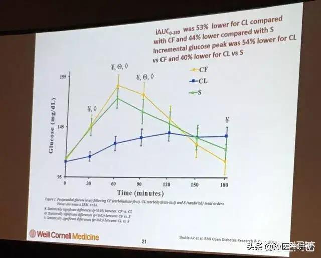 下のグラフは食後血糖値の結果である。青い線は野菜とタンパク質を先に食べた場合、黄色い線はご飯を先に食べた場合、緑の線はご飯と野菜を混ぜて食べた場合である。グラフから、緑線と黄線は明確なピークを示している、つまり、食後1時間で患者の食後血糖は著しく上昇し、緑線はもう少し明らかに上昇し、黄線は低い方であるが、緑線の傾向に非常に近いことがわかる。青い線は比較的安定した状態で、血糖値は食後2時間後に最高点に達するだけで、黄色や緑の線よりもまだ低い。